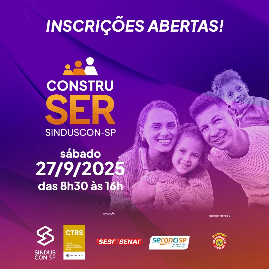 Consciente de que a responsabilidade social das empresas começa com o respeito aos seus funcionários, o SindusCon-SP criou o ConstruSER (Encontro Estadual da Construção Civil em Família), programa que valoriza e inclui socialmente o trabalhador da construção civil e incentiva a interação com seus familiares.