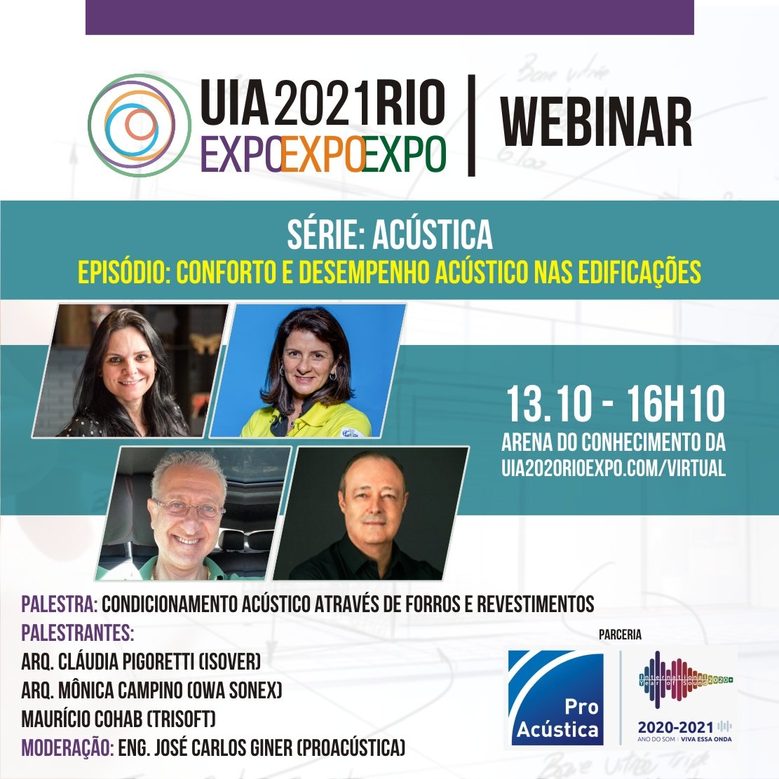 Através da plataforma UIA2021RIO EXPO VIRTUAL | ARENA DO CONHECIMENTO, os webinars da – Série Acústica nas Edificações e Ambiental – terão a participação de representantes das Empresas Associadas Expositoras confirmadas como 01dB Acoem, Armacell, Aubicon, Ecofiber, Giner, Gypsum, Harmonia, Isover, Joongbo, Knauf, Owa Sonex, Passeri, Placo e Trisoft.